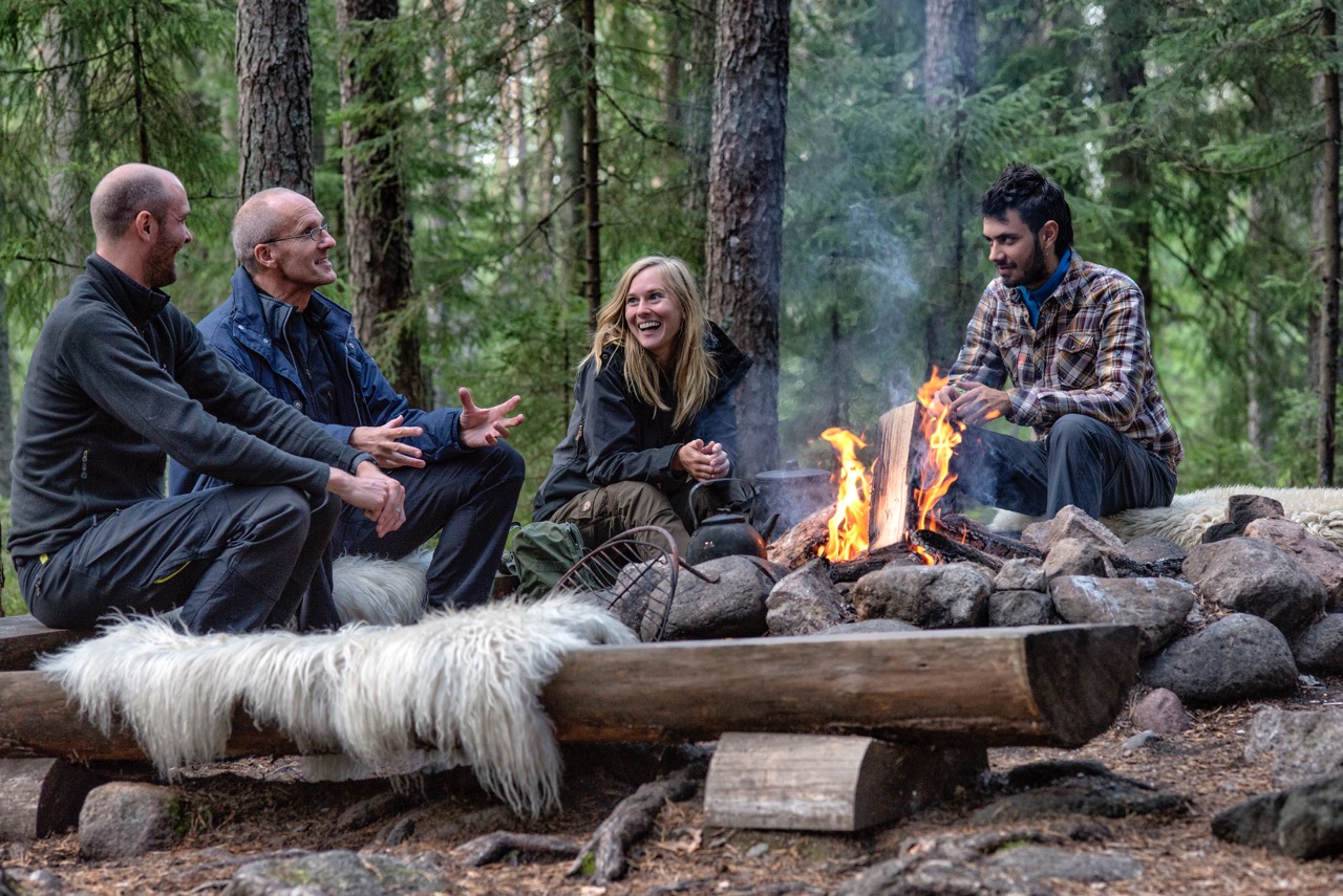 Vi träffar guiderna som visar oss bushcraftens grunder i samband med en täljworkshop runt elden